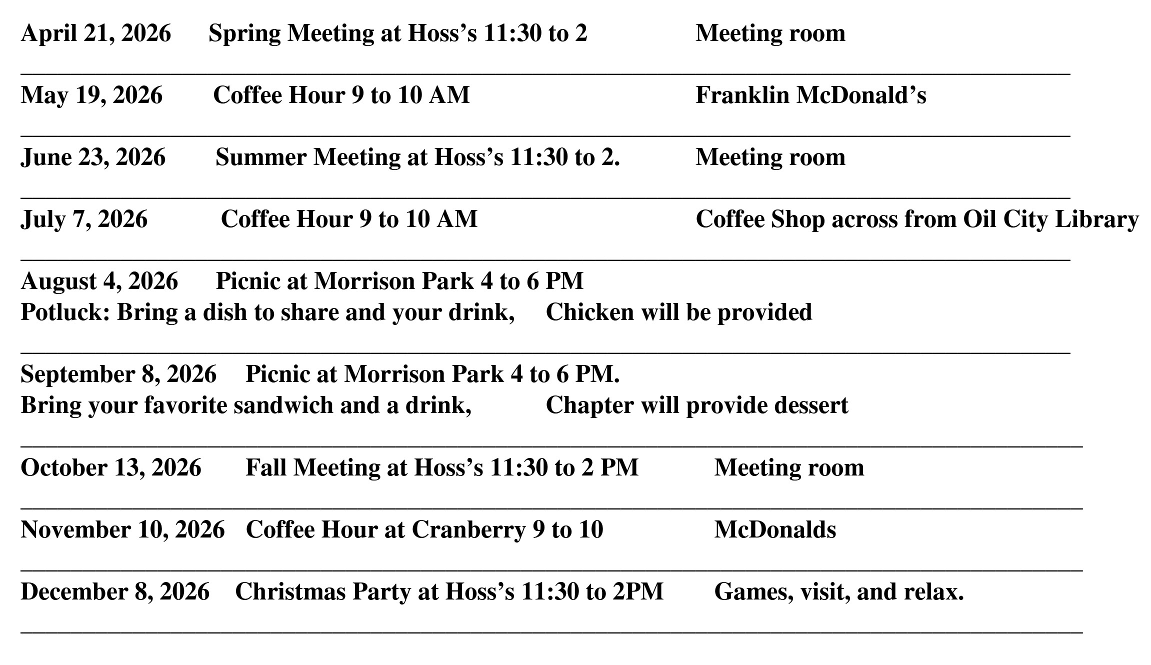 Any changes will be reported to membership in emails and in the newsletter.